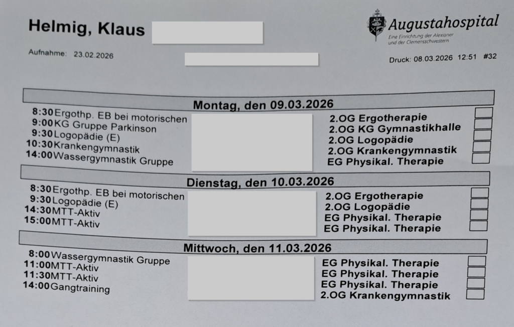 Tag 15 im Augustahospital in Anholt. Ich bin hier in der sogenannte Parkinson-Komplextherapie. Diese Therapie ist kein einzelnes Verfahren, sondern ein intensives, ganzheitliches Behandlungskonzept, das speziell für Menschen mit Parkinson entwickelt wurde. Das Besondere daran ist, dass viele verschiedene Fachrichtungen eng zusammenarbeiten und die Behandlung individuell auf mich abgestimmt wird.