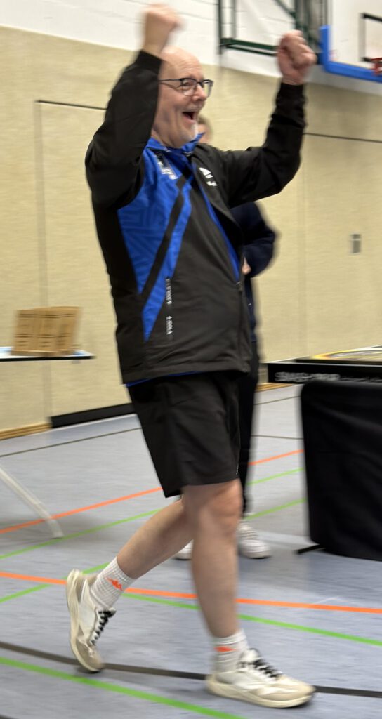 Im Film der Sätze hieß das: 1:0 Herbert, 1:1 Klaus; 1:2 Klaus; 2:2 Herbert und schließlich konnte ich dank meinem befreiten Kopf den 5. Satz mit 11:4 sicher nach Hause bringen und war zum ersten Mal Sieger im Finale LK4 unseres Emscherpokals, was sich dann auch in einem Freudenschrei zeigte.