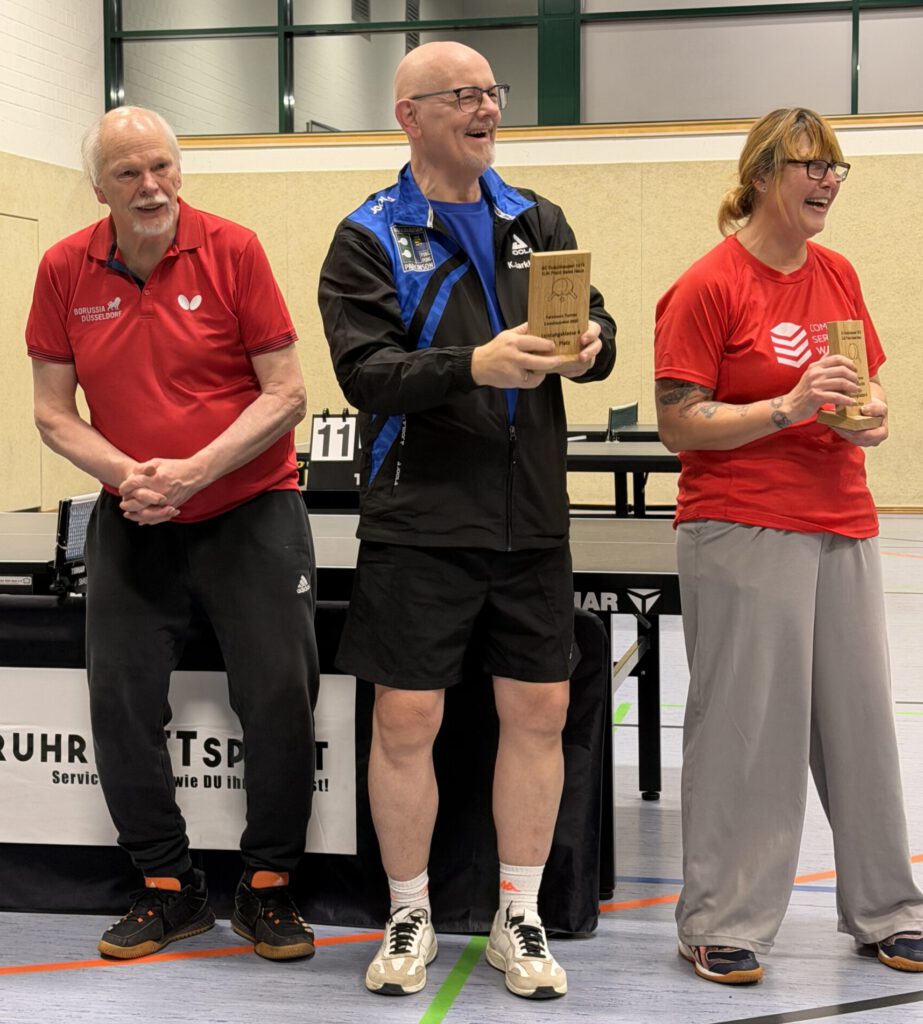 Es begann für mich in der LK4 das Turnier erst in der Hauptrunde richtig. Nach den Siegen gegen Weltmeisterin Sandra und einem 3:0 gegen Ulrich Renner stand ich tatsächlich im 1/4 Finale und musste dort gegen die Kleverin Siggi spielen und … gewann, auch für mich überraschend ziemlich klar mit 3:0. Ich war im Halbfinale und konnte es kaum fassen, dass die Achterbahnfahrt auf der zweiten Runde so abgehen würde. Davon getragen, konnte ich die liebe Nicole von Borussia Düsseldorf ebenfalls ohne Satzverlust bezwingen und stand tatsächlich im Fiiinaaaale gegen Herbert, ebenfalls aus Düsseldorf.