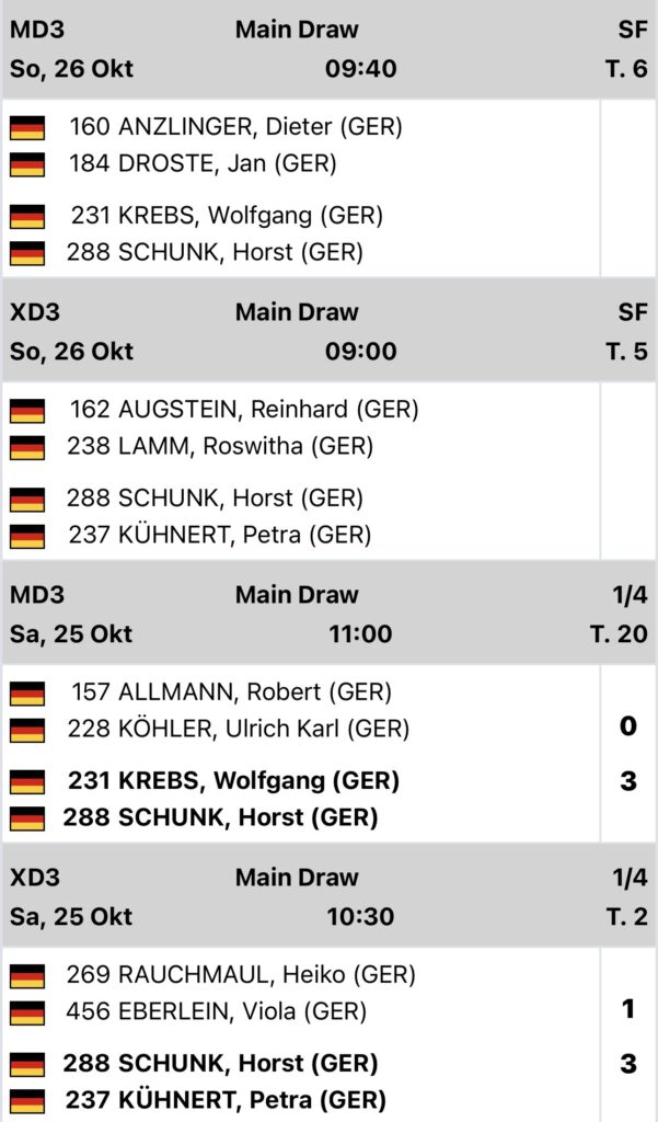 Offenbar hat Ede sich endlich eingegrooved, denn er ist im Mixed ins Semifinale eingezogen und im Doppel ins 1/4-Finale der Klasse drei! (UPDATE: Nach großartigem Spiel ist er nun auch im Doppel durch)