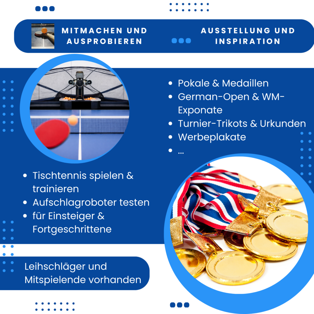 Wir bieten an den 2 Tagen in der Hauptsache auch die Möglichkeit, sich selbst an 2 Tischen mit einem humanen Gegner als auch mit einem Aufschlagroboter auszuprobieren.