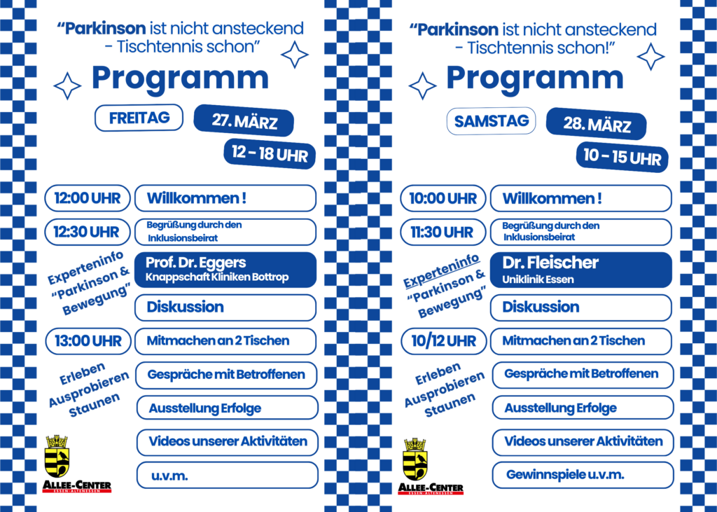 - Samstag 11:30 Uhr: Dr. Michael Fleischer, Leiter Zentrum für Bewegungsstörung an der Uniklinik Essen, neurologische Klinik